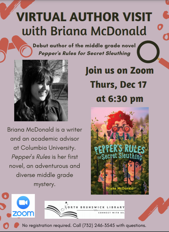 Do you like detective stories? Briana McDonald, author of Pepper’s Rules for Secret Sleuthing, joins us on Zoom for a lunchtime chat. She’ll talk about her book as well as the writing process, followed by a chance to ask questions. The book and this program are recommended for children in grade 3 and above.